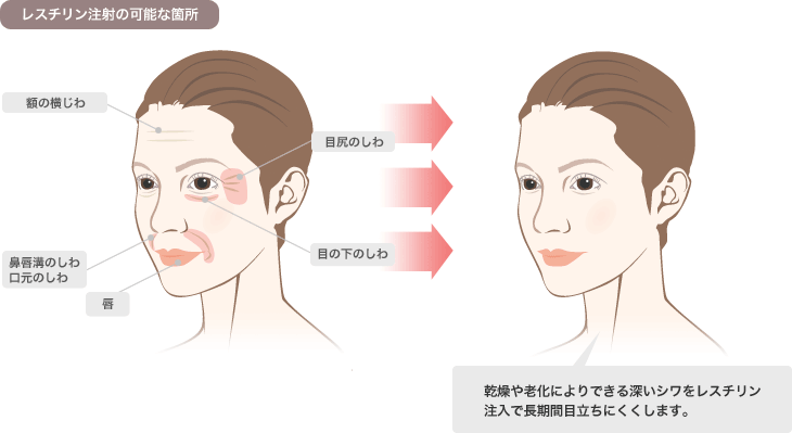 レスチレン注射により改善できるしわは「目尻のしわ」「目の下のしわ」「口元のしわ」「鼻唇溝のしわ」など乾燥や老化によりできた深いしわです。