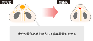 余分な軟部組織を除去し軟骨をよせることで、すっきりと細い鼻先に変わることができます。